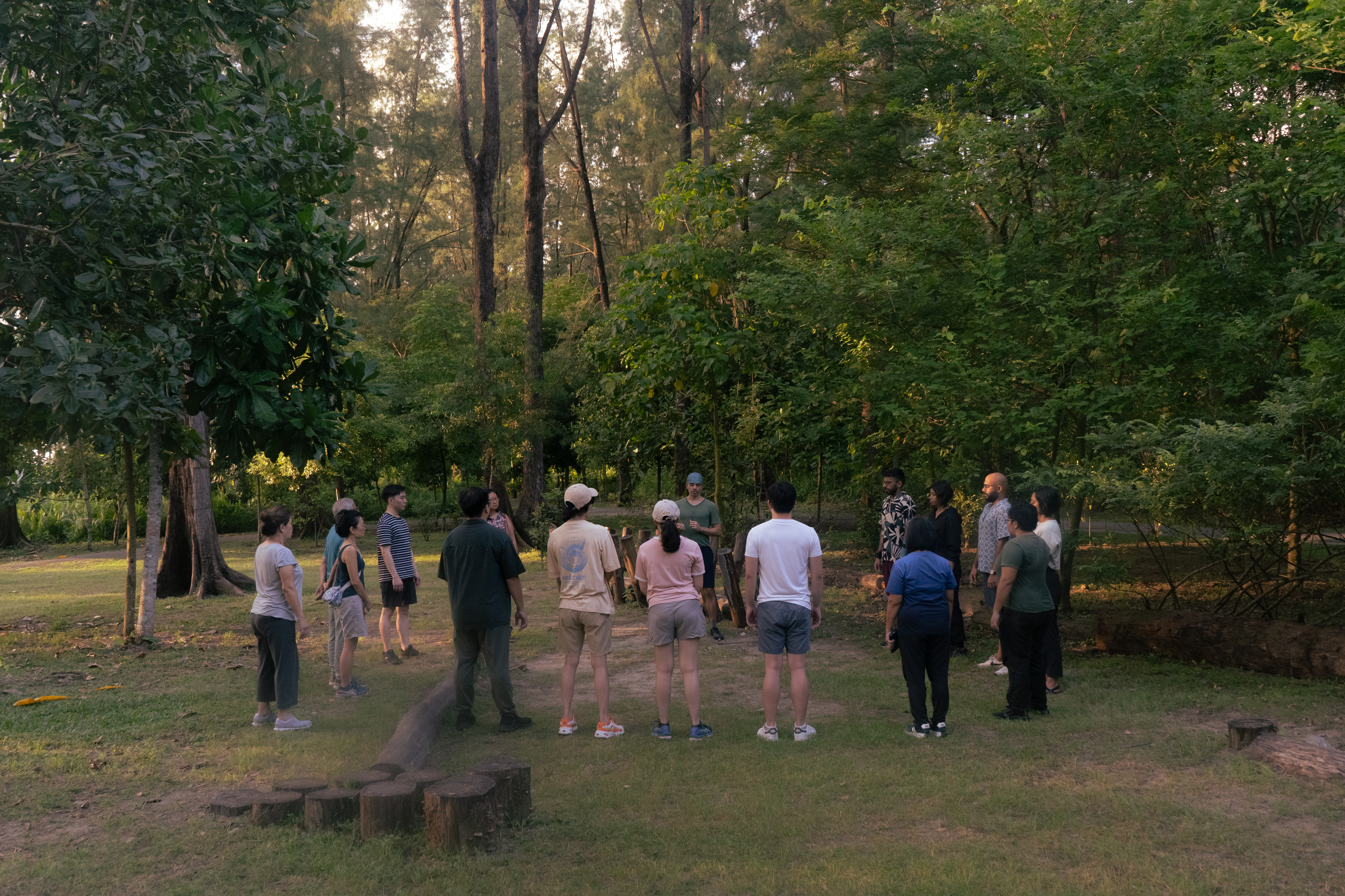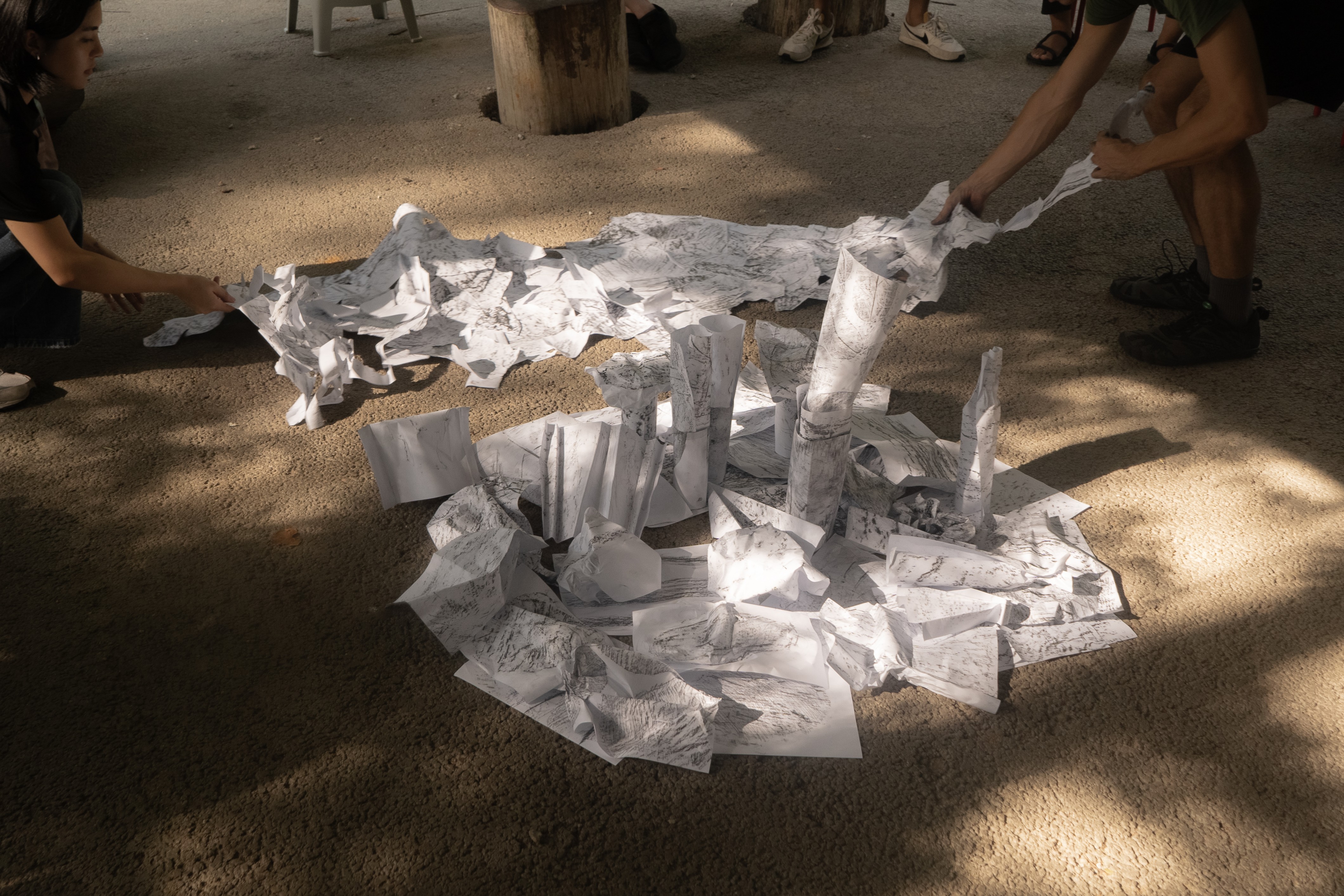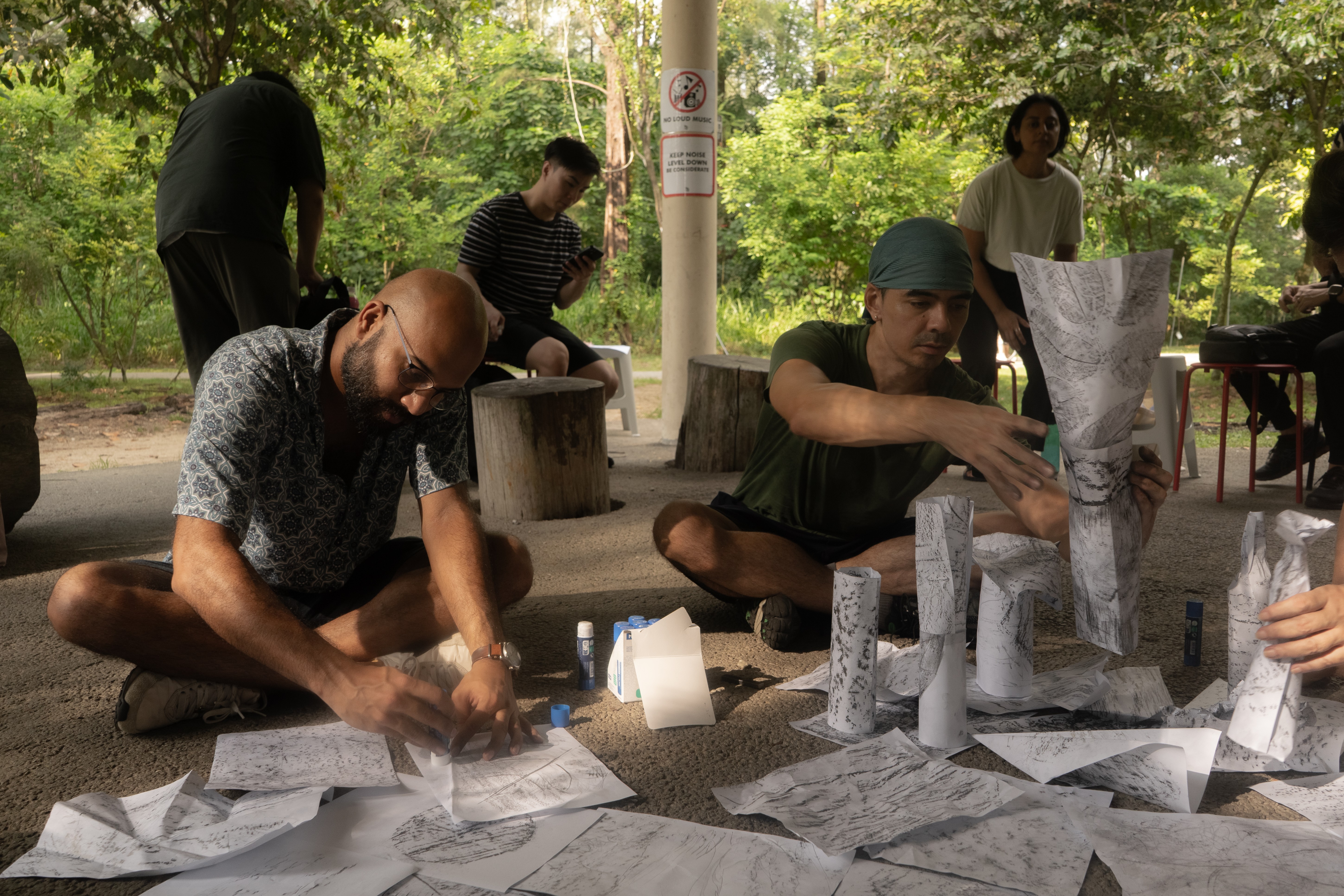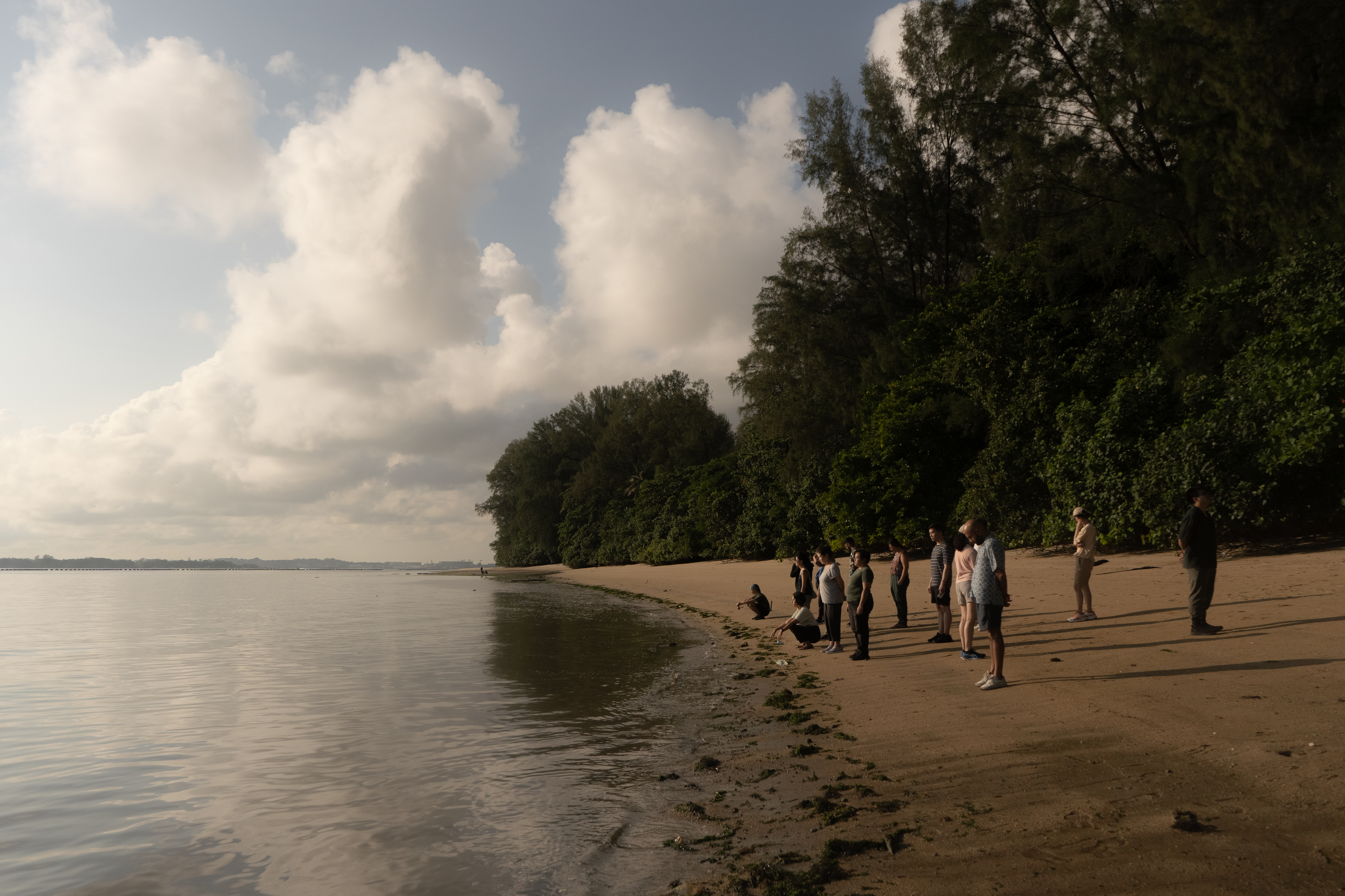 At sunrise on Coney Island, we gathered for Attuning to Nature, a workshop led by sound artist Zai Tang that invited us to reconnect with our surroundings and ourselves. Beginning with a breathing exercise, eyes closed and minds cleared, we prepared not for the rush of the day, but to attune to nature’s unhurried rhythms. Zai then handed out worksheets prompting us to explore sound through specific tasks, such as discerning noises both near and far. These seemingly simple instructions sharpened our senses, immersing us so deeply that even his calling bell faded beneath the soundscapes of birds and insects. A silent soundwalk drew us further into Coney Island’s layers: at each pause, we stood listening to rustling casuarina leaves, crash of waves, morning joggers, the various elements forming the unique characteristic of Coney Island, and each person connected in their own personal way. In the second half, childlike wonder emerged through frottage, with coal pencils and paper in hand, we tiptoed and crouched, feeling surfaces, discovering overlooked textures, and sharing our finds in delight. The workshop closed with a discussion of our experiences before we tore and pieced our frottage papers into a collective artwork that, serendipitously, formed the outline of Coney Island itself. A gesture of connection to the land and its sounds, and to each other, as we spent a morning of connection on this island.