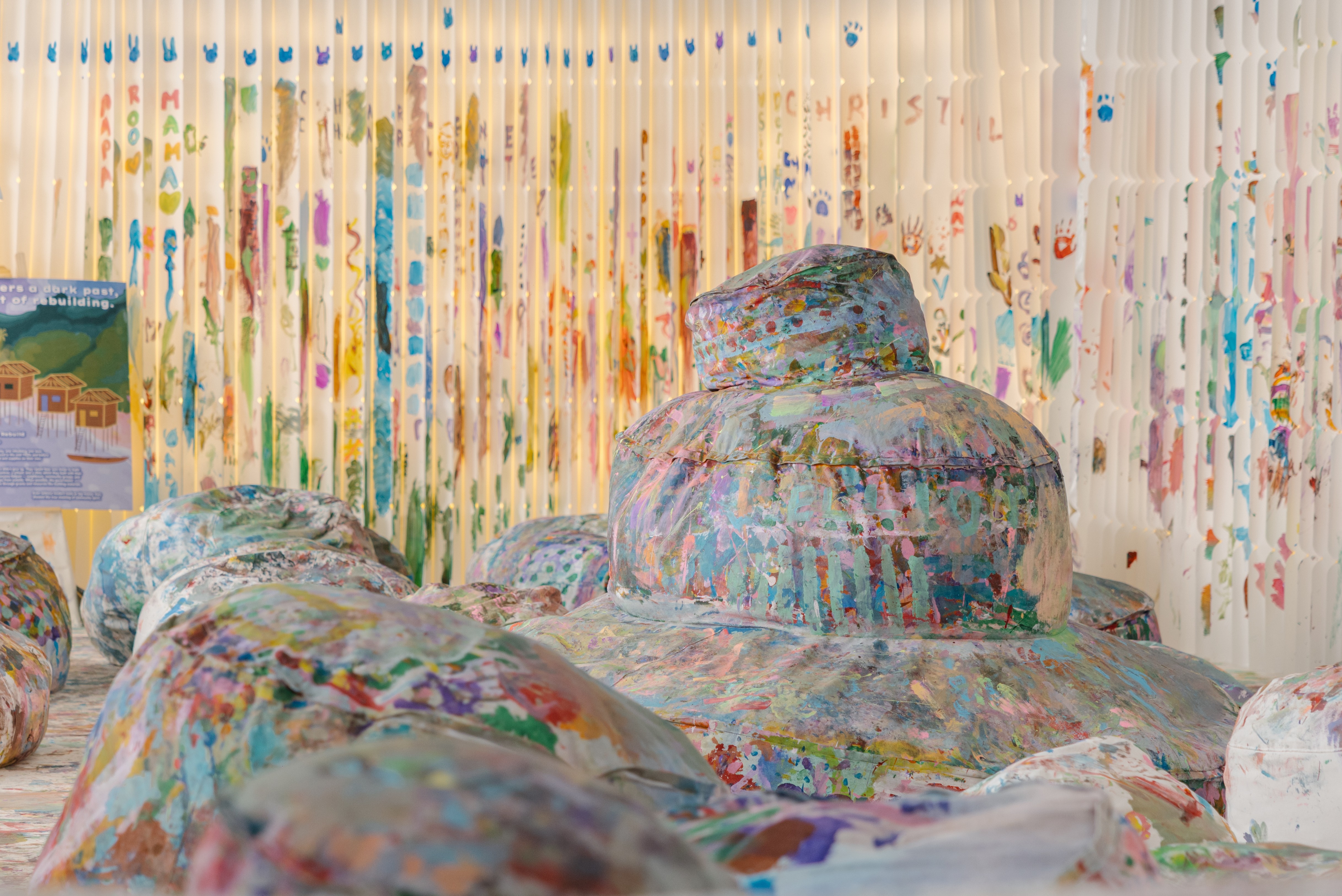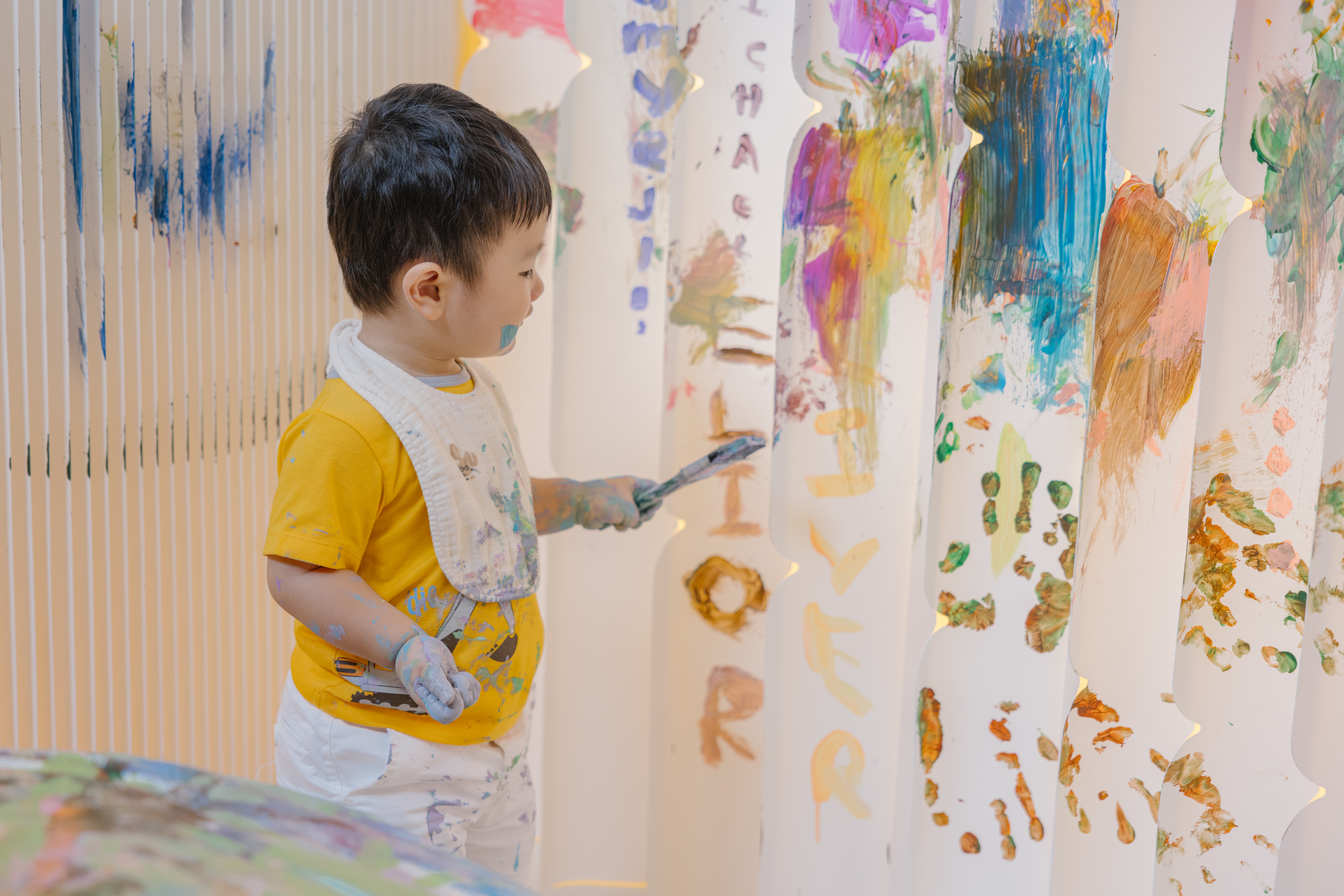 Set within the bustle of Waterway Point Mall, Colours on Shore is an collaborative and interactive artwork by Mit Jai Inn. Warmly lit and circular in layout, the beige interiors tied with the soft canvas sculptures evoke the sandy shores of Punggol Beach, offering a sense of calm amidst the everyday rush. Participants, of all ages and backgrounds, express their creativity by painting directly onto the space, creating a work that constantly evolves. Each mark told a story, from games played to conversations shared between strangers and friends, capturing fragments of the many lives that passed through this transient space. Over ten days, the soft canvas sculptures gradually evolved as layers of colour built up, the forms and colours shifted, and by the end, the sculptures had built up layers of paint that settled into a unified blend of blue and seafoam green, like tides washing over a beach. What began as a shoreline slowly became a sea, shaped by those who passed through, each leaving something of themselves behind.